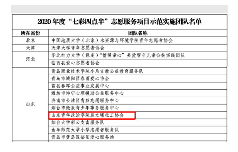 7月18日,团中央青年志愿者行动指导中心、中国青年志愿者协会秘书处公布了2020年度“七彩四点半”志愿服务项目示范实施团队名单,我校晨之曦社工协会成功入选并获得2万元基金资助。