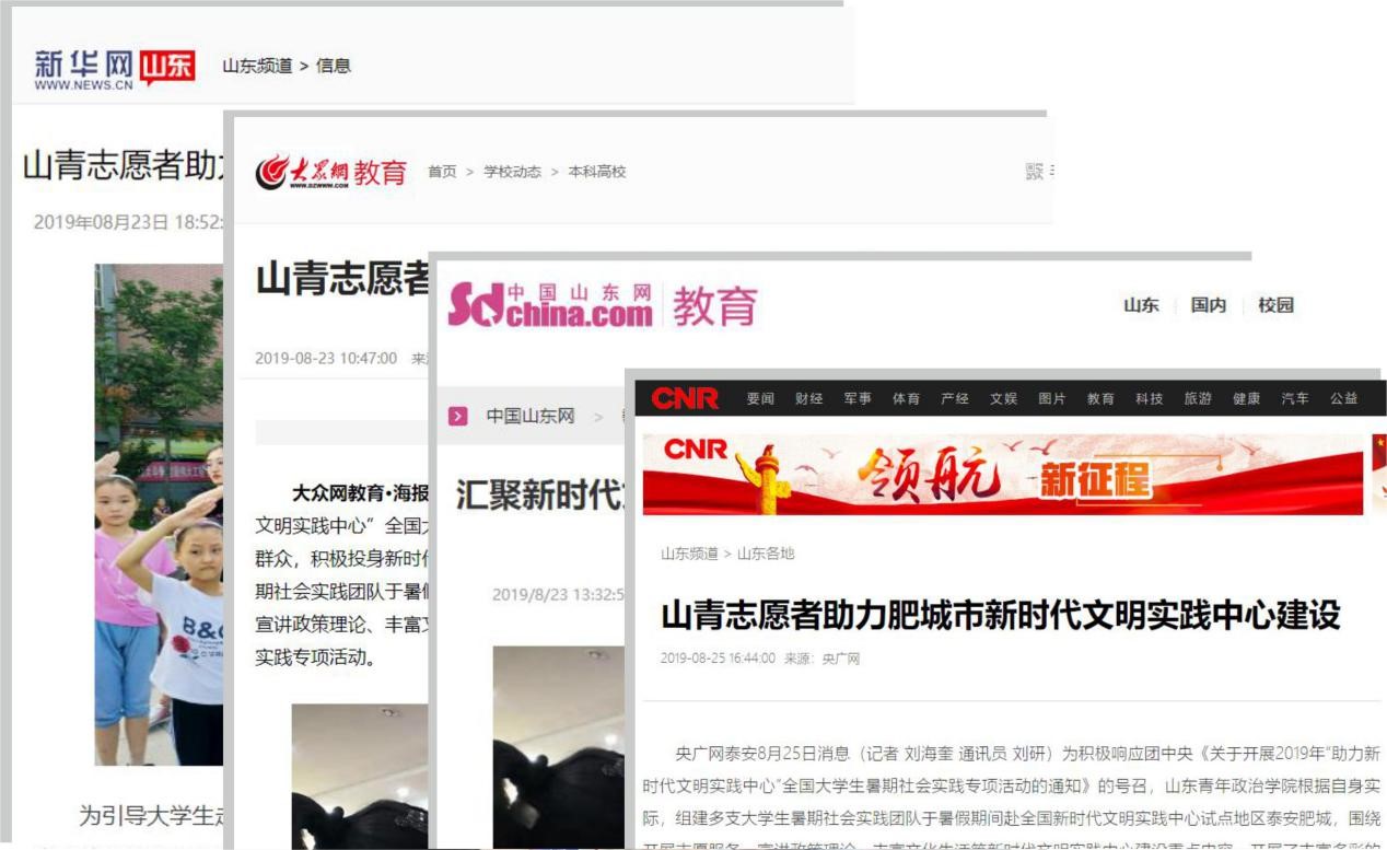 实践期间,广大山青学子围绕习近平新时代中国特色社会主义思想和党的十九大精神,开展宣讲报告、学习座谈、调查研究、政策宣传等形式的社会实践活动,立足基层,在实践中受教育、长才干、作贡献。各项实践活动组织实施细致周密,特色亮点鲜明突出,取得了丰硕成果,先后受到大众网、央广网、新华网、中国山东网、山东商报、济南日报、齐鲁晚报、山东青年报等社会各界媒体的广泛关注,给予了多层面、多方位的深入报道,实践活动成果显著,产生了良好的社会反响,赢得了社会各界的广泛赞誉。部分新闻报道相关信息如下: