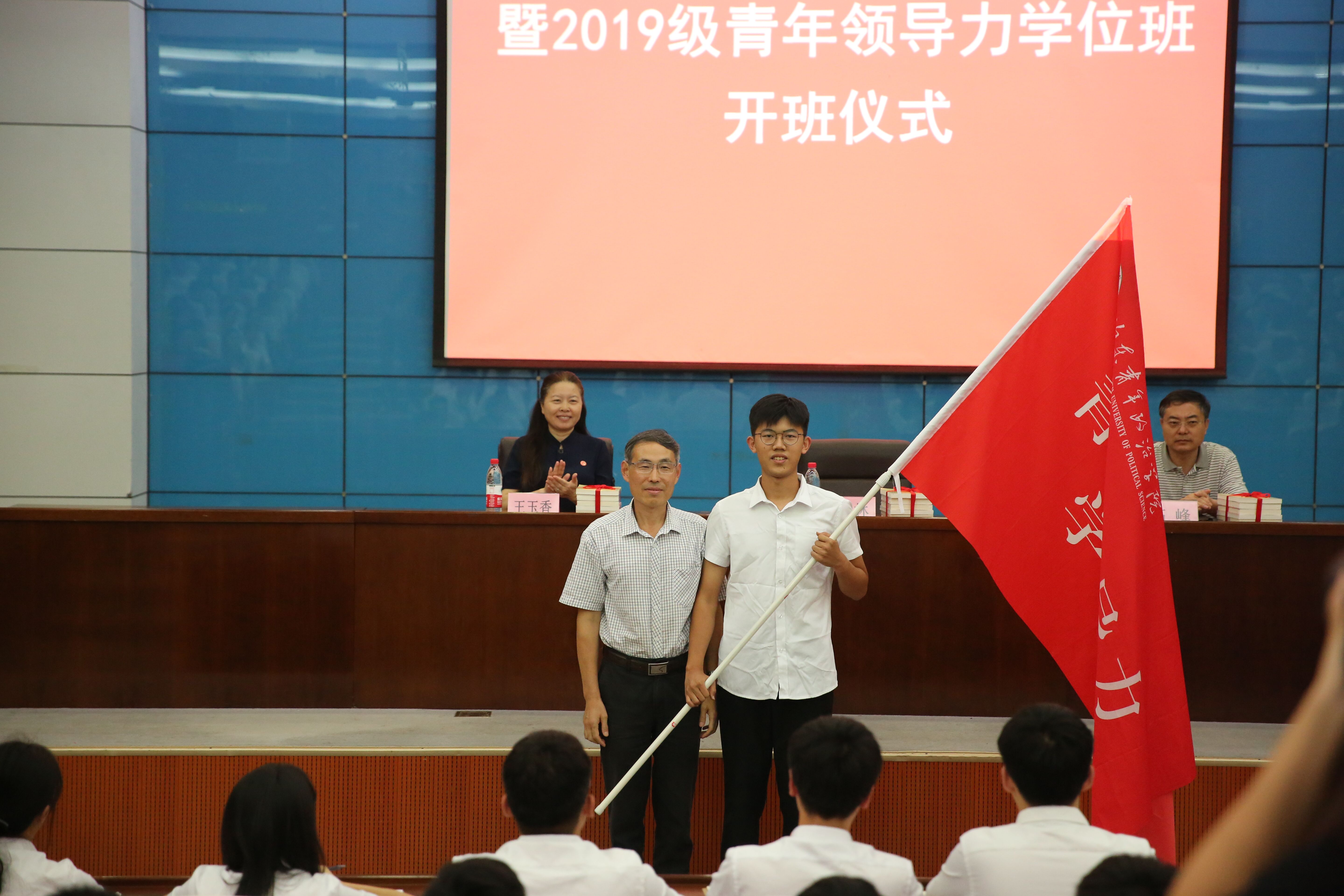 开班仪式上,党委书记鹿林为2019级青年领导力学位班授旗开班,并为学生代表赠书。