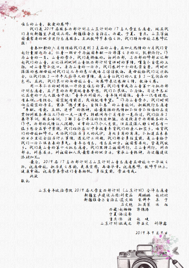 我们是2019届服务西部计划与山东计划的17名大学生志愿者,现在我们身处新疆生产建设兵团、新疆维吾尔自治区、西藏、宁夏、重庆、山东等祖国最需要的地方进行志愿服务。至此教师节来临之际,我们特向母校与恩师汇报: