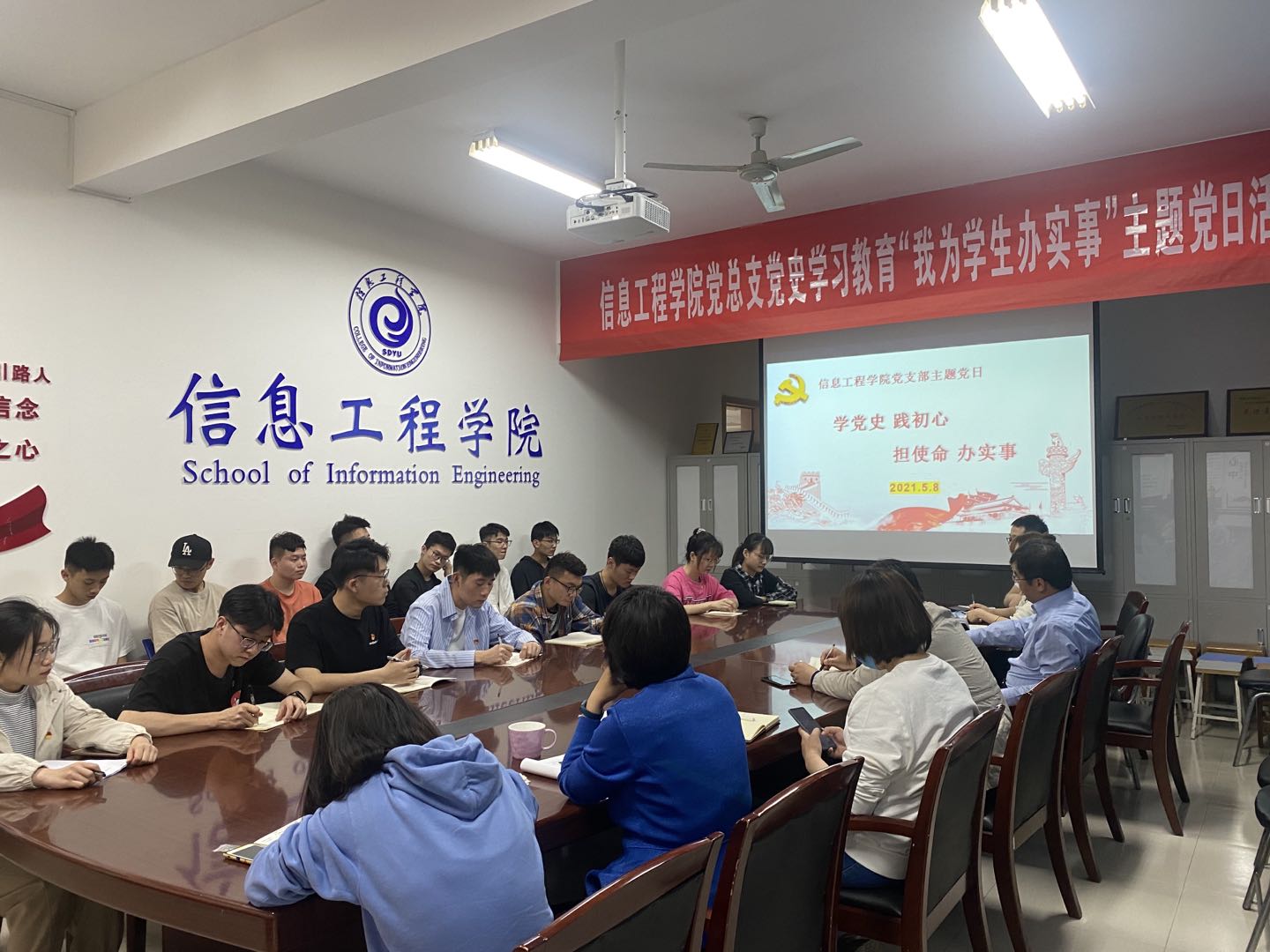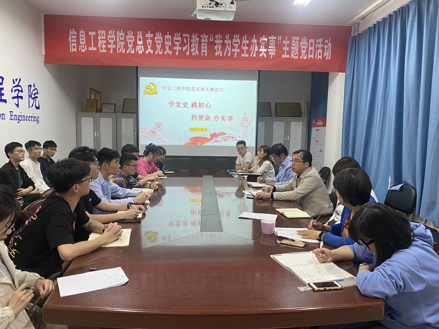 为扎实推进党史学习教育,全面了解学生合理需求,信息工程学院党总支于5月8日在笃行楼309开展“我为学生办实事”主题党日活动。信息工程学院党总支书记王黎峰、党总支副书记马骋、教工第一党支部书记李香英、办公室副主任党豫君、全体辅导员及学生党员代表与学生代表出席本次会议。