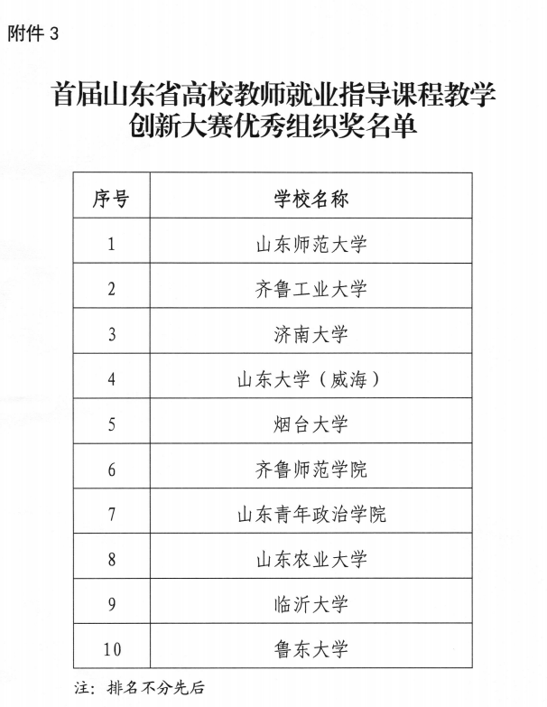 近日,从《山东省人力资源和社会保障厅 山东省教育厅关于公布2021年全省高校就业创业金课和首届全省高校教师就业指导课程教学创新大赛结果的通知》(鲁人社函〔2021〕62号)获悉,在首届全省高校教师就业指导课程教学创新大赛中,学校辅导员李仁大获得决赛铜奖,学校获得优秀组织奖。