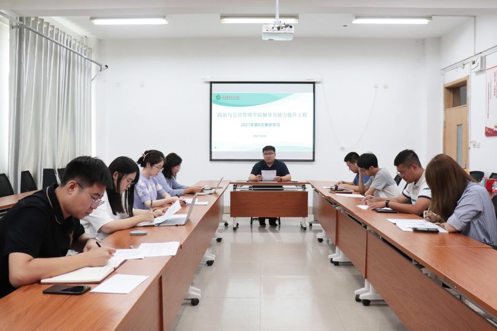 为深入学习习近平总书记“七一”重要讲话精神,加强学院学工队伍理论素养和能力建设,8月26日上午,政治与公共管理学院在敏行楼104会议室举行2021年第八期辅导员能力提升沙龙,集体学习习近平总书记在庆祝中国共产党成立100周年大会上的重要讲话,学院全体辅导员参加此次学习,学院党总支副书记王正坤领学。