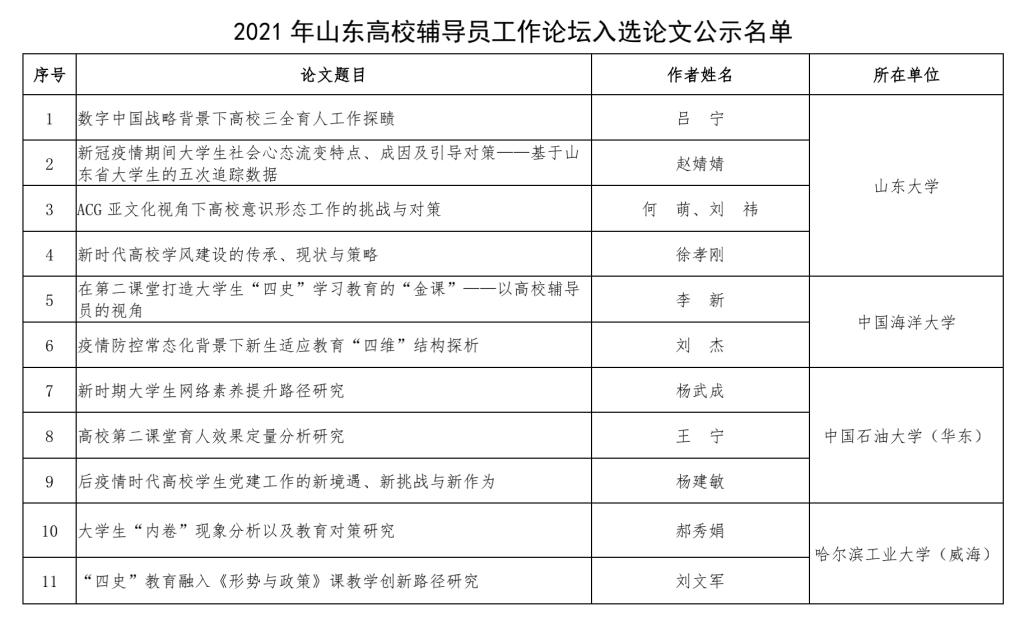 2021年高校辅导员工作论坛6月份启动,旨在推动全省高校辅导员队伍专业化职业化建设,落实立德树人根本任务,以优异成绩庆祝中国共产党成立100周年。此次共有127篇征文入选,论文的第一作者将参加2021年山东高校辅导员工作论坛。山东高校辅导员工作论坛每年举办一次,是教育部高校辅导员培训和研修基地(山东大学)落实《高校思想政治工作质量提升工程实施纲要》的重要举措,是落实服务山东战略的重要内容,是提升山东高校思想政治工作者的工作能力、工作科学化水平的重要方式。