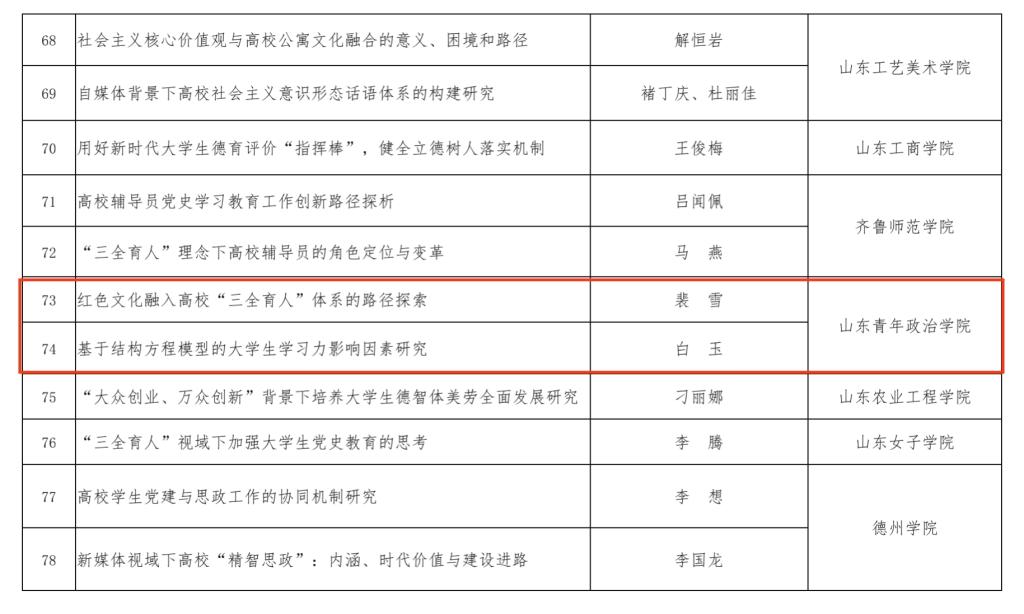 近日,2021年山东高校辅导员工作论坛入选征文公示,我校信息工程学院辅导员白玉的《基于结构方程模型的大学生学习力影响因素研究》和经济管理学院辅导员裴雪的《红色文化融入高校“三全育人”体系的路径探索》同时入选。