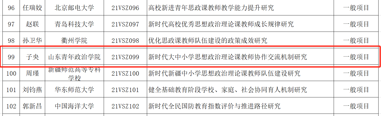 全国哲学社会科学工作办公室于9月26日公布了2021年度国家社科基金高校思政课研究专项立项名单。本次国家社科基金思政课研究专项经专家评审、社会公示并报全国哲学社会科学工作领导小组批准,共立项151项,其中山东省立项8项。我校教师子央主持的课题获得立项,实现了我校国家社科基金高校思政课研究专项的突破。