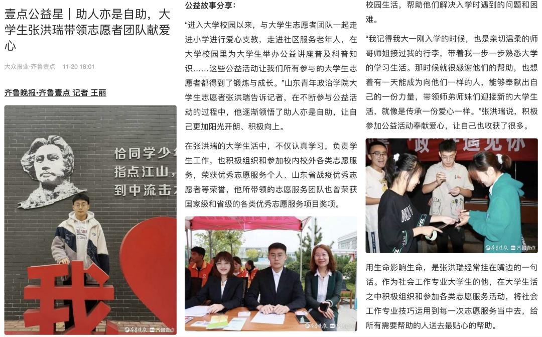 12月5日是第36个国际志愿者日,在节日来临之际,《齐鲁晚报》齐鲁壹点APP“壹点公益星”栏目报道了我校政治与公共管理学院2019级社会工作专业学生张洪瑞志愿服务先进事迹。