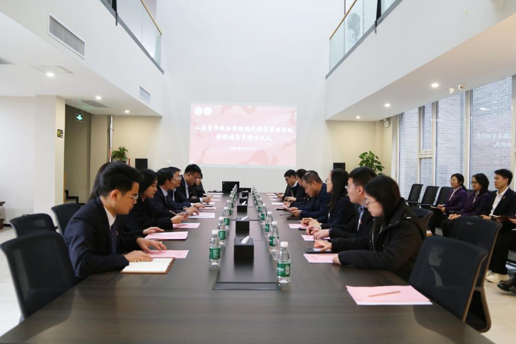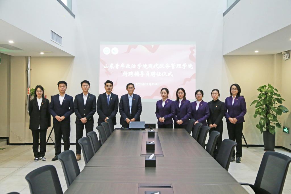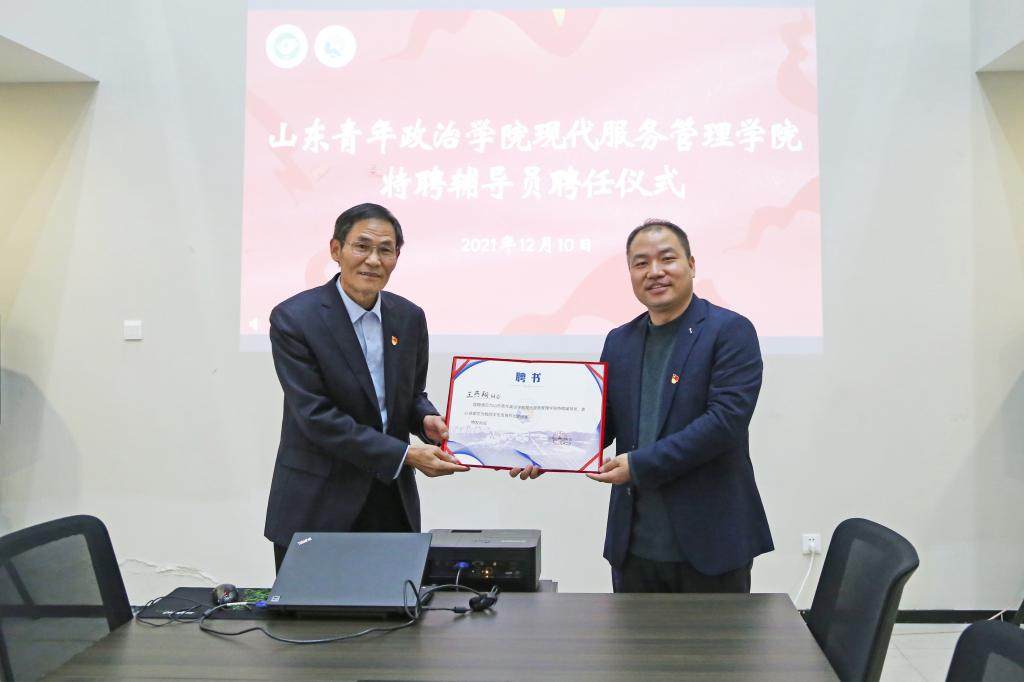 12月10日下午,现代服务管理学院举行首场特聘辅导员聘任仪式,正式启动特聘辅导工作机制。沂蒙干部教育培训中心党支部书记邢庆杰、副主任王燕翔、教育部主任王庆鹏,现代服务管理学院院长杨文凯、党委副书记薛卿、全体辅导员以及部分学生党员代表参加了聘任仪式。沂蒙干部教育培训中心副主任王燕翔受聘为学院特聘辅导员。现代服务管理学院院长杨文凯向特聘辅导员王燕翔颁发聘书。