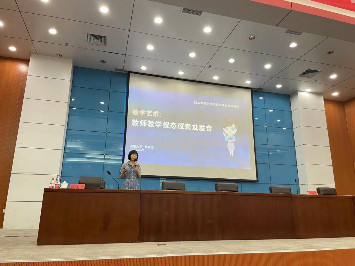 8月21日下午,济南大学教师发展咨询专家陈晓洁教授以“教师教学仪态仪表及发音”为主题,从形象得体、动作稳重、眼神真诚、情绪投入、声音洪亮等方面,对教师的仪态仪表进行了专业指导,最后引出教学艺术的底层逻辑。随后组织观看了南京大学教授、博士生导师桑新民教授的“名师谈成长”专题讲座,桑教授结合自身经历与体会,从“你为什么当教师?什么是大学?信息时代大学教师面临挑战机遇”三个主题阐述了高校教师的成长与发展路径。