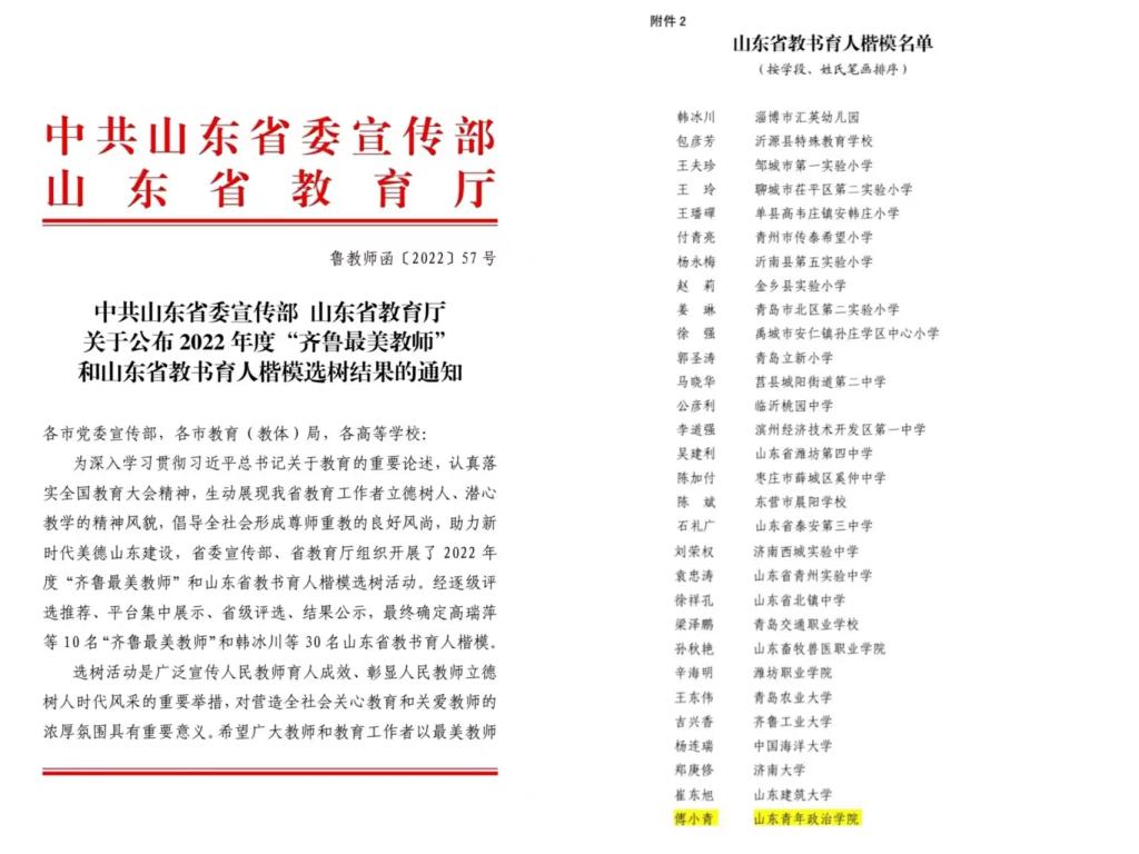 为深入学习贯彻习近平总书记关于教育的重要论述,认真落实全国教育大会精神,生动展现我省教育工作者立德树人、潜心教学的精神风貌,倡导全社会形成尊师重教的良好风尚,助力新时代美德山东建设,省委宣传部、省教育厅组织开展了2022年度“齐鲁最美教师”和山东省教书育人楷模选树活动。经逐级评选推荐、平台集中展示、省级评选、结果公示,最终确定高瑞萍等10名“齐鲁最美教师”和韩冰川等30名山东省教书育人楷模。我校舞蹈学院院长傅小青教授当选2022年度山东省教书育人楷模。