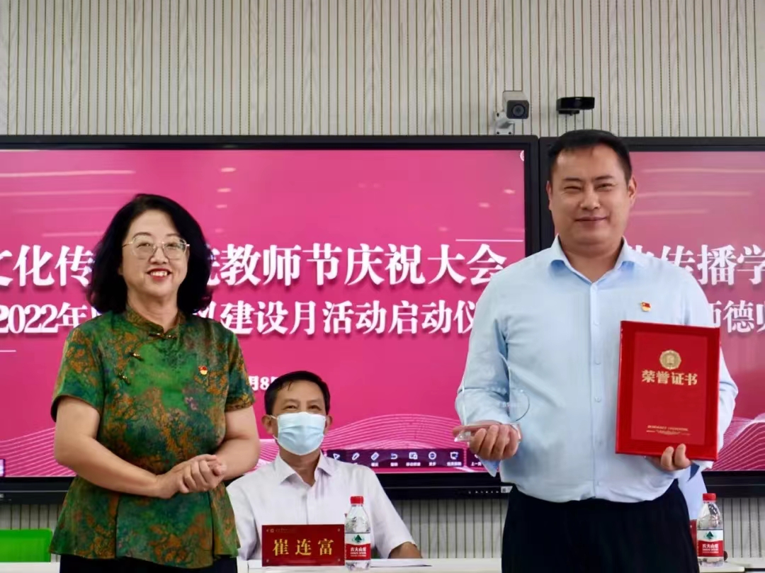 党委委员、纪委书记崔连富首先代表学校党委,向辛勤耕耘在一线的广大教育工作者致以节日的问候,总结了2022年上半年文化传播学院教师在各方面取得的成就,谈到了当前学校、学院面临的巨大挑战和机遇。他提到,面对新形势、新机遇、新挑战,一定要从学校发展的战略高度,统一思想、提高意识,正视和重视教师队伍的培养问题。对此,他提出几点希望。一要慎终如始坚决做好疫情防控,发扬连续作战、敢打敢胜的精神,坚守好阵地,守护好学生;二要真诚关心爱护学生,树立崇高的职业理想,恪尽职守;三要积极探索教育教学新模式,提高科研水平和专业教学能力,做到严谨治学;四要进一步强化职业道德规范,牢记教书育人天职,把为党育人为国育才、立德树人的根本任务铭记在心。他强调,“教师”不仅仅是一种称呼,它是一种责任,一种使命。希望广大教师进一步增强光荣感、责任感、使命感,不断提高思想政治素质和业务水平,以优异的成绩迎接党的二十大胜利召开。