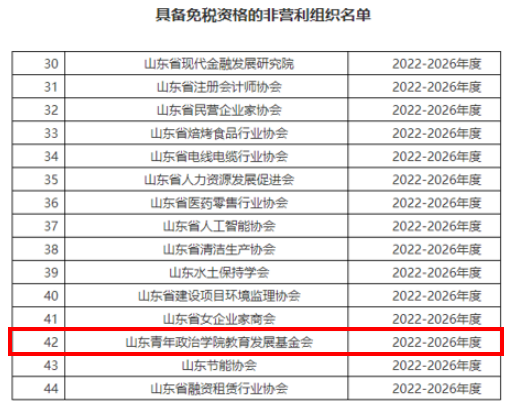 近日,山东省财政厅、国家税务总局山东省税务局联合印发《关于公布2022年第二批具备免税资格的非营利组织名单的通知》,我校教育发展基金会获批非营利组织免税资格,有效期为五年。