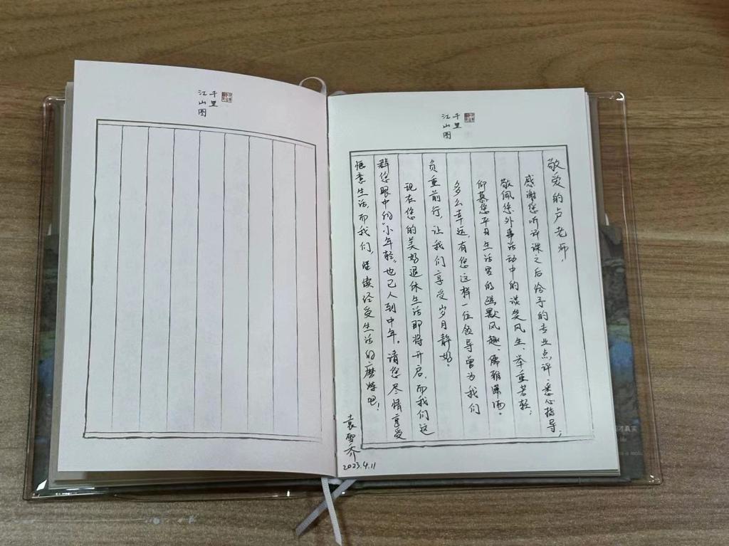 邵光庆宣读山东青年政治学院文件《关于卢杰退休的通知》,并向卢杰颁发退休纪念品“新山青”金丝珐琅摆盘和“外语人”光荣退休纪念牌。范红伟在主持中向卢杰同志表达了真挚祝福,衷心希望他“常回家看看”,继续为学院发展献计献策,并向他赠上一本特殊的纪念册。翻开纪念册,师生共同书写的密密麻麻的赠言和祝福跃然纸上,饱含着深深的师生情和浓浓的同事情。