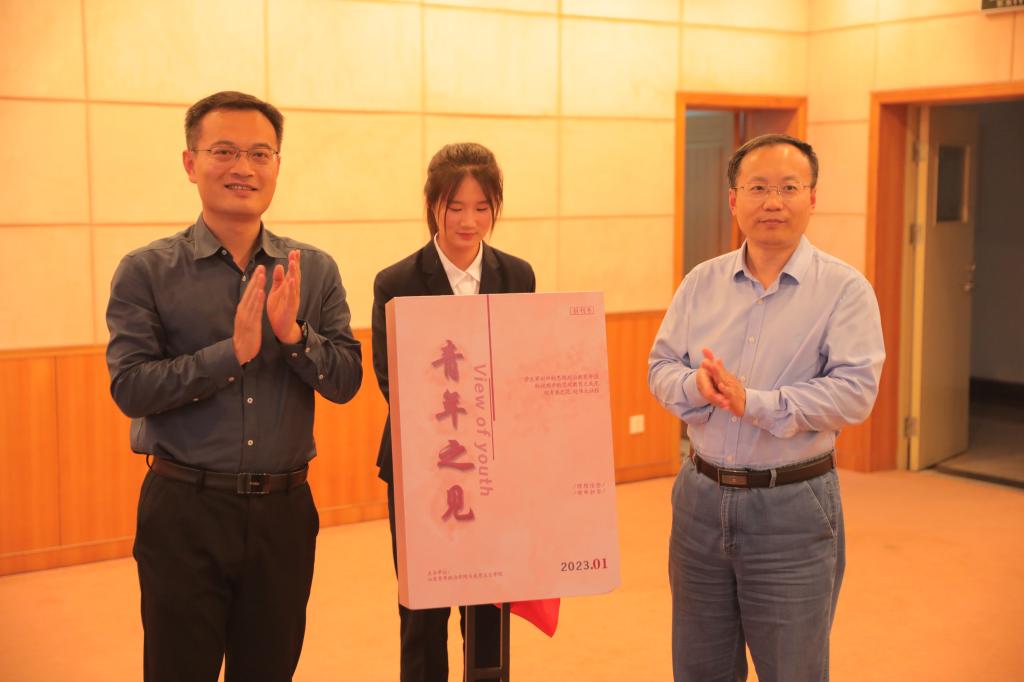 仪式上,马克思主义学院院长刘丙元致发刊辞并宣布《青年之见》正式创刊。蒋涛涛和刘丙元院长共同为《青年之见》揭刊,并为2022年度青马培训班优秀学员代表赠书。