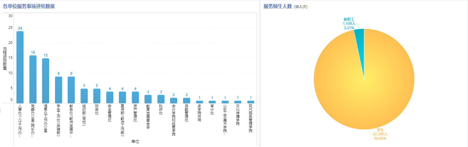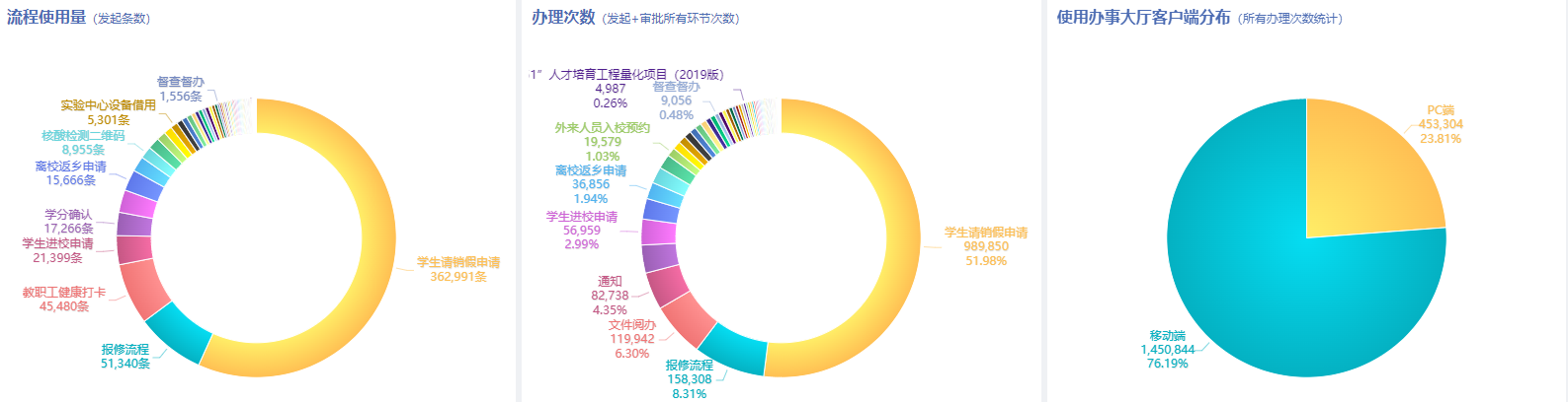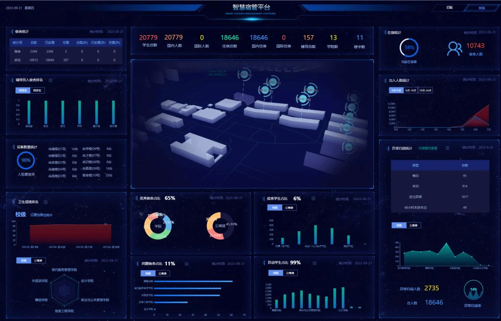 构建领导驾驶舱,通过数据主题大屏为领导提供直观的数据展示;实现人事管理、干部线上管理、年度干部考核工作,全校科研工作线上管理;更新学校网站群和官网,完成舆情管控平台和校园融媒体建设;开发专业技术职务评聘、“51251”人才工程申报、公开招聘、个人年度考核;建设智慧学工综合管理服务平台,实现宿舍智能管理、查寝、查卫生、出入门禁;第二课堂线上管理服务,实现了学生全方位培养;升级智慧财务,实现网上报销、预算制定下发、线上查工资;强化校园安防一体化平台,实现人、车智能自动监控、自动预警、出入校园智能化管控和线上预约进出;实现餐厅、超市等消费场景的支付宝、微信、银联扫码支付等。