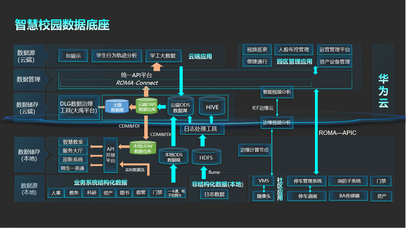 基于公有云“沃土数字平台”夯实智慧校园数据底座,以大数据平台为核心,实现全校范围的数据融合,建成智慧校园全域数据仓库,实现IT治理转型升级。本地数据中心部署对安全和性能要求较高的核心业务系统,存储关键的业务数据;公有云端部署部分Web应用访问,按需索取各类公有云资源,通过边缘计算节点加速私有云和公有云间的数据交互。引入公有云数据治理平台、ODS数据湖的能力,开展数据治理,分布抽取、分散控制、集中管理,实现信息资源和数据资产的集约、共享与管理。对接公有云物联网平台,实现端到端、端到云、云到云的连通,让智慧校园具备了链接行业、产业及智慧城市的能力。