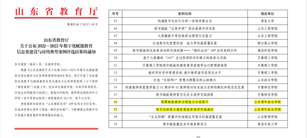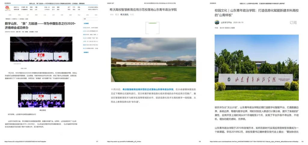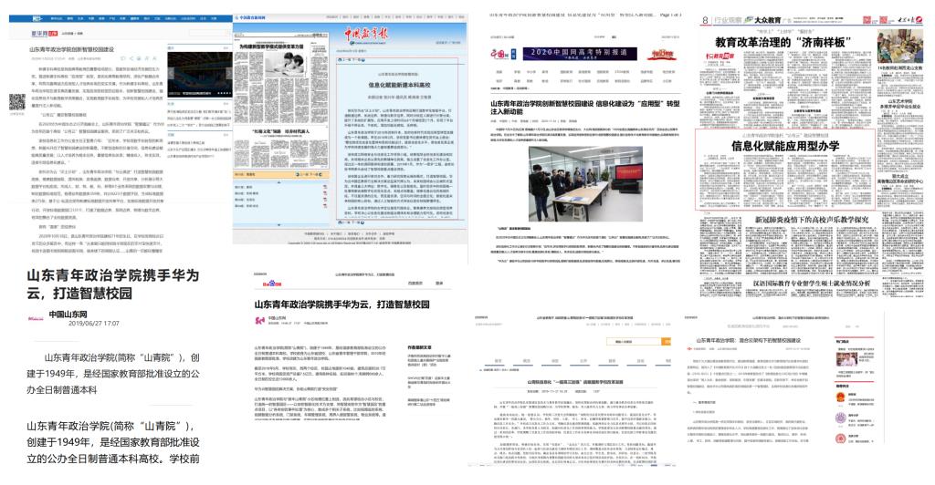 学校“智慧崝云 数据赋能智慧山青应用”获评山东省工业和信息化厅“三优两重”省级优秀大数据应用案例;“信息化技术赋能高校平稳应对重大疫情”荣获山东省教育厅疫情防控环境下信息化应用优秀案例;是华为云首个高校“公有云”智慧校园建设案例。