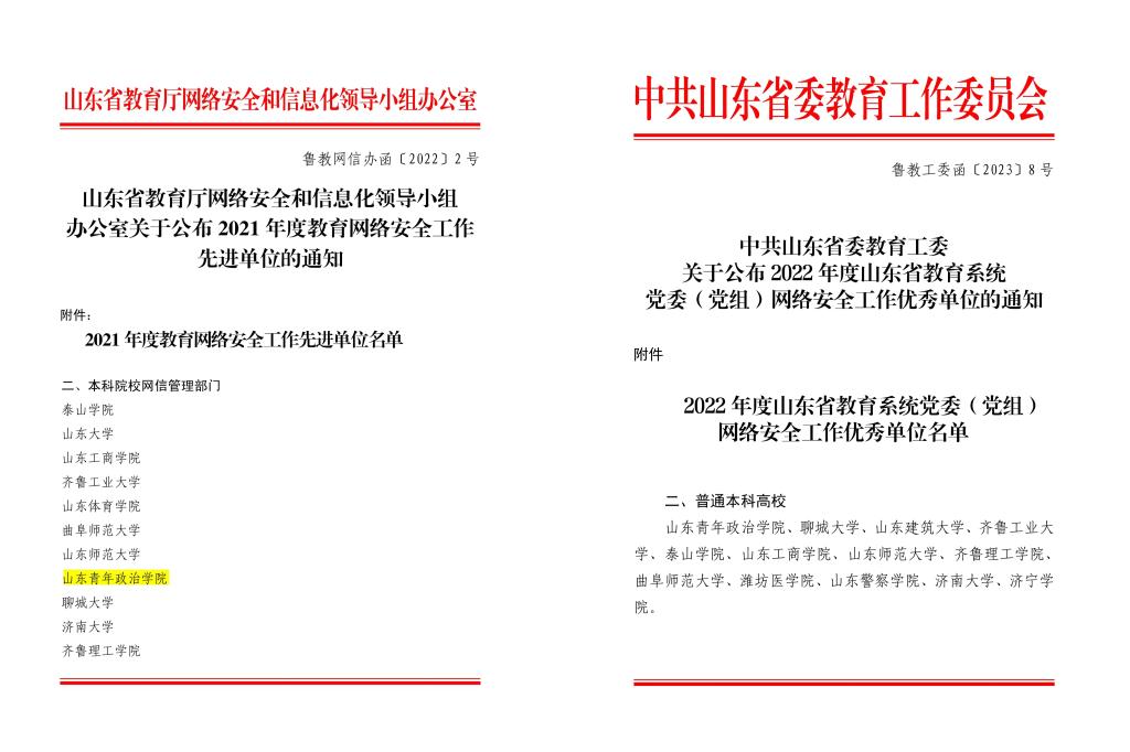 始终把坚持党的全面领导落实到网信工作全领域各环节,在学校党委的坚强领导下谋划和推进网信工作,深入贯彻落实《党委(党组)网络安全工作责任制实施办法》。2018年,学校成立网络安全和信息化领导小组,党委书记和校长担任双组长,制定网络安全和信息化领导小组会议制度,定期研究学校网信工作,提高学校信息化决策的科学化、民主化水平,充分发挥网络安全和信息化领导小组在学校网络安全和信息化工作中的政治领导作用。学校连续3年(2020、2021、2022)在山东省委教育工委公布的山东省教育系统党委(党组)网络安全工作考核结果中获得先进单位、优秀单位。