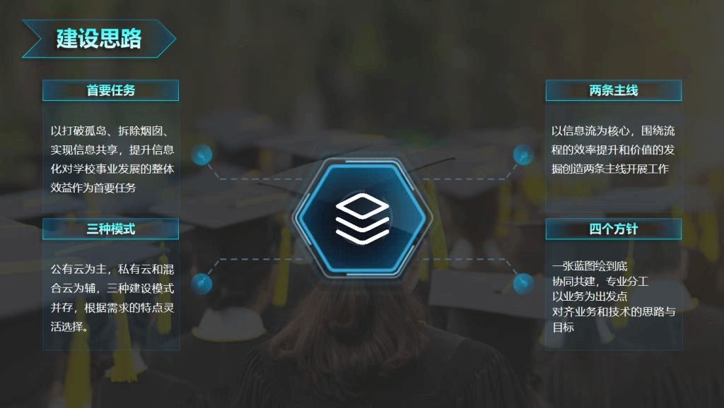 联手业界顶级战略规划专家团队开展大调研、大讨论,制定信息化中长期发展规划。以规划蓝图为牵引,顶层设计,统筹实施,内挖潜力,外拓资源;以服务师生的项目建设为抓手,校企协同、专业分工;以价值效益为导向,打破孤岛、拆除烟囱、实现数据共享。遵循“需求牵引、应用为王、服务至上、示范引领、安全运行”的总体发展理念,谋划“一二三四”建设路径:“一”是首要任务,以打破数据孤岛、实现信息共享,提升信息化对学校事业发展的整体效益为首要任务。“二”是两条主线,以信息流和数据为核心,围绕业务流程的效益提升和数据价值的发掘创造两条主线开展建设。“三”是三种模式,以公有云为主,私有云、混合云为辅的三种技术模式有机融合。“四”是四个方针,即以需求为导向,以服务为出发点,业务与技术对齐,一张蓝图绘到底。