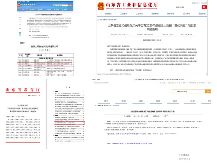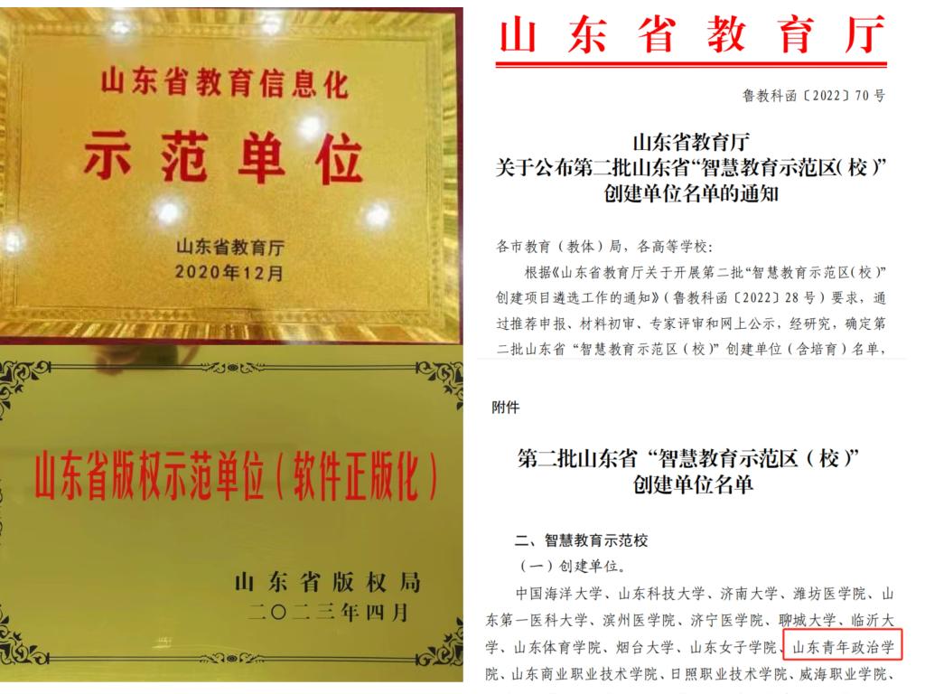 学校连续三年(2020-2022)被山东省教育工委评为全省教育系统网络安全工作先进单位、优秀单位;2020年通过第二批山东省教育信息化试点验收并获优秀单位,入选第二批教育信息化示范单位典型创新案例;2021年被省大数据局评选为省级大数据创新应用场景;2022年入选第二批“山东省智慧教育示范校”,被省版权局和省教育厅评选为山东省版权示范单位(软件正版化)称号;2023年2项案例入选山东省教育系统数字化赋能教育信息化建设与应用典型案例。