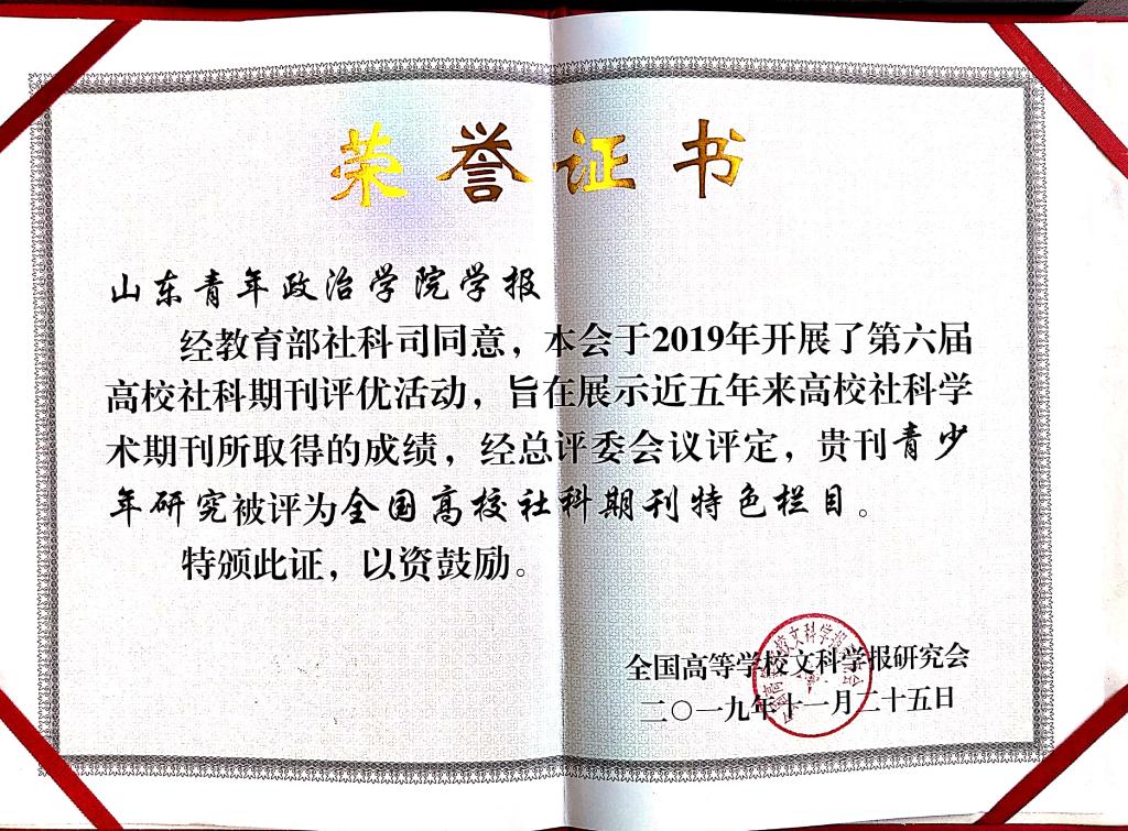 五年来,学报栏目建设持续优化,“青少年研究”栏目被评为“全国高校社科期刊特色栏目”。编校质量不断提升,在中宣部出版局部分学报编校质量抽查中,学报位居山东省内第一。编辑队伍业务水平不断增强,学报主编翟瑞青多次当选全国高校文科学报研究会理事、山东省高校学报研究会常务理事、全国高职成高学报研究会副会长,2名编辑先后被全国高校文科学报研究会、全国高职成高学报研究会评为“优秀编辑”;期刊复合影响因子逐年提高,学报先后被评为“中国人文社会科学期刊AMI综合评价(2022年)”扩展期刊、“RCCSE中国准核心学术期刊(B+)”。