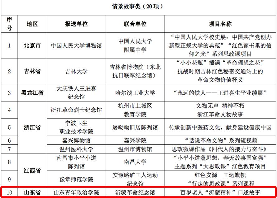 近日,国家文物局办公室和教育部办公厅联合公布了《以革命文物为主题的“大思政课”优质资源项目名单》,我校与沂蒙革命纪念馆联合申报的“百岁老人沂蒙精神口述故事”项目成功入选。
