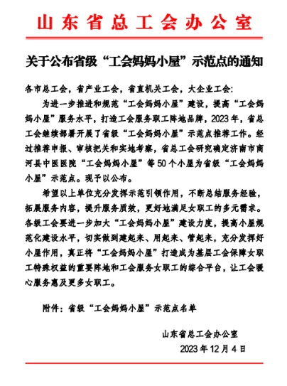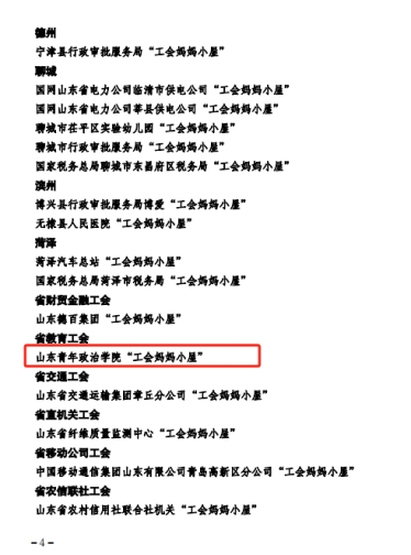 12月4日,山东省总工会发布《关于公布省级“工会妈妈小屋”示范点的通知》,我校“工会妈妈小屋”荣获省级“工会妈妈小屋”示范点称号。