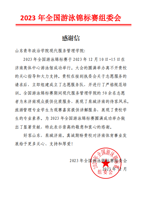 12月10日—15日,2023年全国游泳锦标赛在山东省济南市奥体中心游泳馆成功举办,现代服务管理学院青歌志愿服务队遴选50名青年优秀学生代表,以高标准、严要求的工作作风和专业化、规范化的周到服务圆满完成了为期6天的志愿服务工作,得到了各级领导及主办方的高度赞扬。