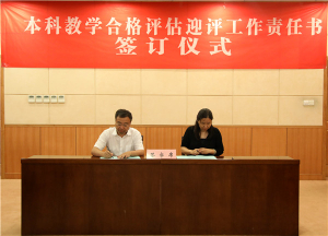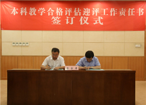 6月29日,学校在学术会议厅召开迎评工作调度会。学校党委书记鹿林出席会议并讲话,党委副书记、院长张书明与各单位、各部门主要负责人签订了《本科教学合格评估迎评工作责任书》,党委副书记高峰宣读了责任书。全体校领导、处级干部参加会议。会议由副院长陈雨海主持。