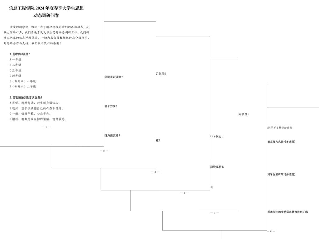 学院结合学生工作实际,聚焦学生所思所想,为进一步提升育人工作找准方向,精心设计《信息工程学院2024年春季大学生思想动态调研问卷》。内容设计覆盖课程学习、学风建设、心理状态、职业规划、就业择业、资助帮扶、日常生活等各方面。对象选择覆盖全年级,面向学院全体学生发放调研问卷,系统、客观地获取学生思想状况的基础数据和现实状况。通过对调查问卷进行逐项统计、归纳、分析,形成《信息工程学院2024年度春季大学生思想动态调研报告》,充分了解到学生思想动态,力求做到“剖析典型、把握规律、以点带面”,为后期更加科学开展学生思想政治教育和学生教育管理提供决策依据和工作参考。