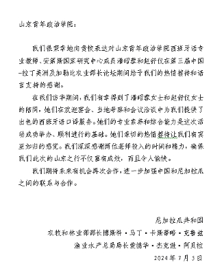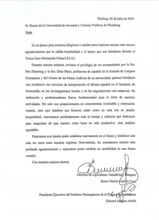 7月8日,学校收到潍坊国家农业开放发展综合试验区转发的来自尼加拉瓜共和国农牧和林业部部长与渔业水产总局局长的感谢信,信中对我校外国语学院西班牙语专业教师、安第斯国家研究中心成员潘昭蓉、赵舒仪在第三届中国—拉丁美洲及加勒比农业部长论坛期间提供的语言交传服务和专业的农业信息介绍表示感谢。