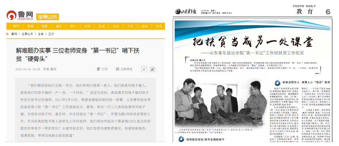 近期,我校“第一书记”驻村帮扶工作经验、成效受到媒体关注。4月9日“山东第一财经门户”鲁网发布《解难题办实事三位老师变身“第一书记”啃下扶贫“硬骨头”》,4月10日山东青年报登载《把扶贫当成另一处课堂——山东青年政治学院“第一书记”工作组扶贫工作纪实》,分别报道了我校派驻临清市刘垓子镇“第一书记”工作组徐世太、姜伟、李洪等三名同志驻村后迅速熟悉情况、转换角色、理清思路、带领当地群众脱贫致富的事迹。