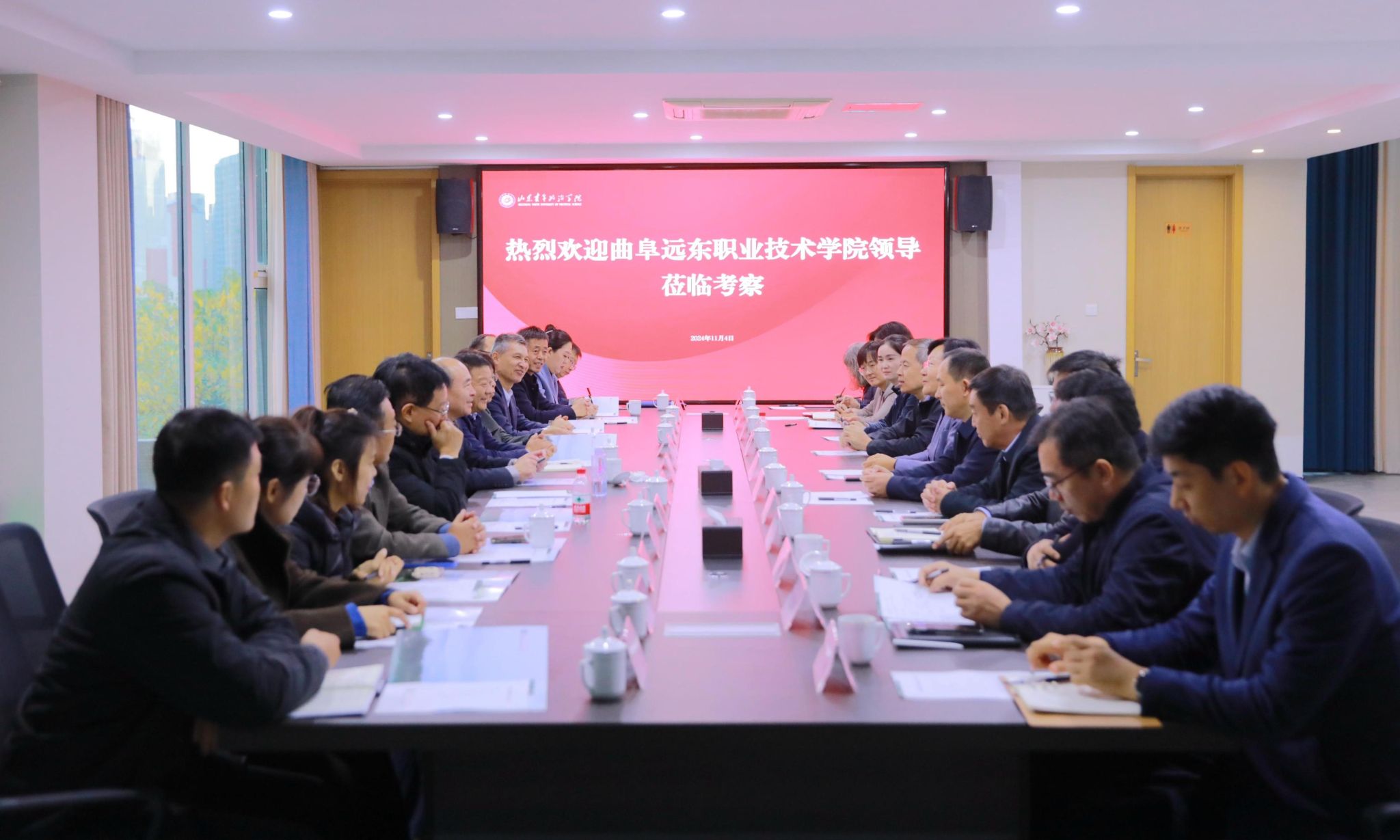 11月4日,曲阜远东职业技术学院党委书记王林山、执行院长许可一行来校调研交流,学校党委书记魏艳菊会见并举行座谈。党委副书记、院长辛杰,党委副书记刘涛,党委委员、副院长张杰出席活动。