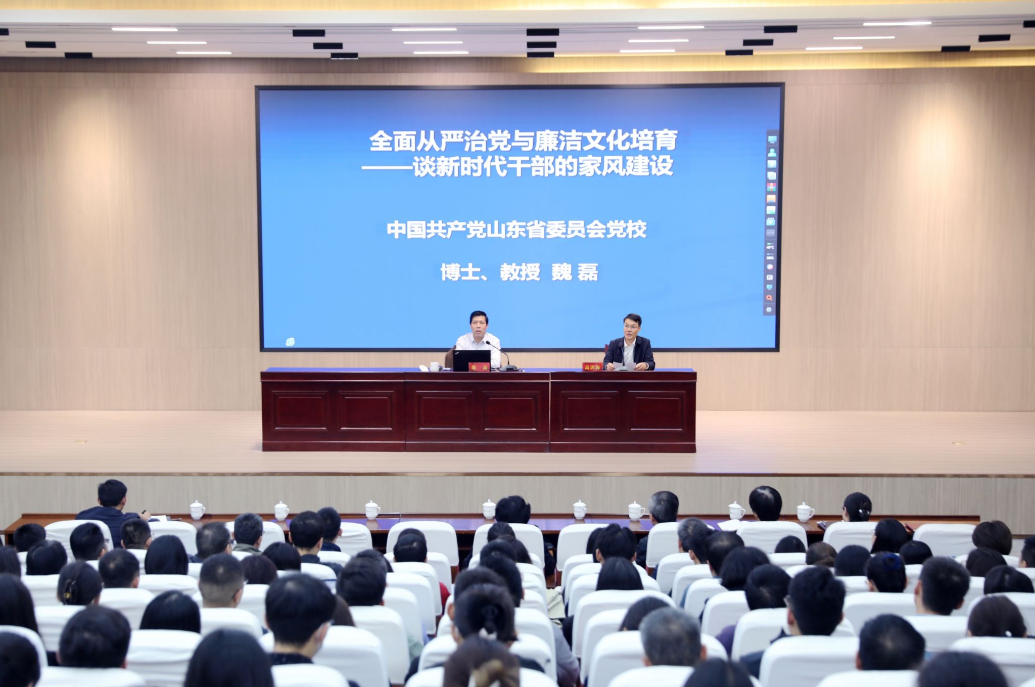 11月14日下午,学校干部家风建设专题报告会在图书馆学术报告厅举行。中共山东省委党校(山东行政学院)魏磊教授应邀作辅导报告。在家校领导、副处级以上干部、全体党支部书记、基层工会主席、女工委员、部分学生党员参加学习。报告会由学校党委委员、纪委书记、监察专员高洪海主持。