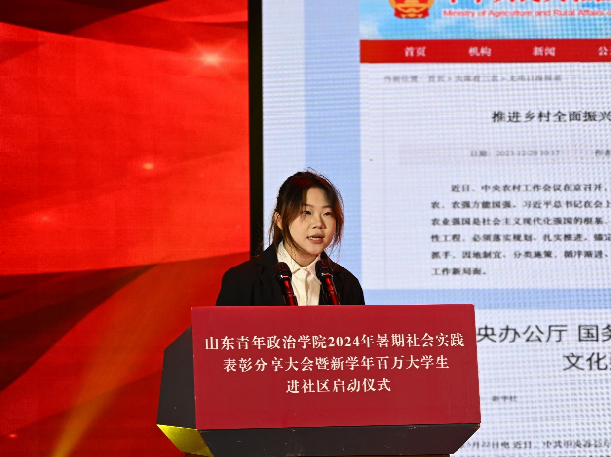 12月12日下午,学校2024年暑期社会实践表彰分享大会暨新学年百万大学生进社区启动仪式在大学生活动中心顺利举行。学校党委委员、副院长于秀国,党委委员、宣传部部长石瑞宝出席会议。相关部门负责同志、各学院分管学生工作负责同志、暑期“三下乡”社会实践团队代表及各学院师生代表共同参会。
