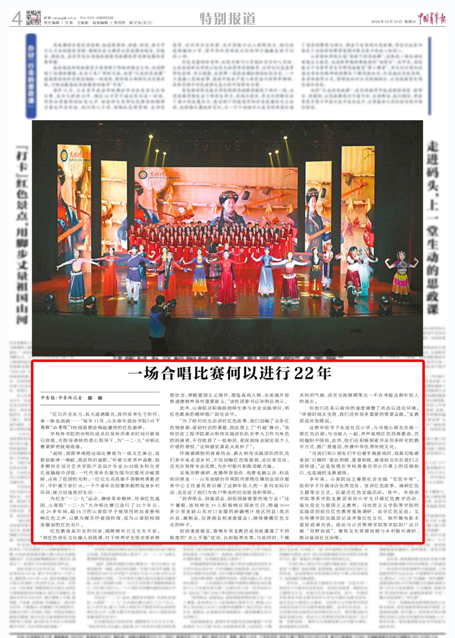 12月15日,《中国青年报》第4版以《一场合唱比赛何以进行22年》为题,报道山东青年政治学院“一二·九”大合唱比赛已进行了22个年头,超16万的山青学子接续用热血青春唱响红色之声,以歌为媒共抒爱国热情,成为校园文化靓丽的红色名片。