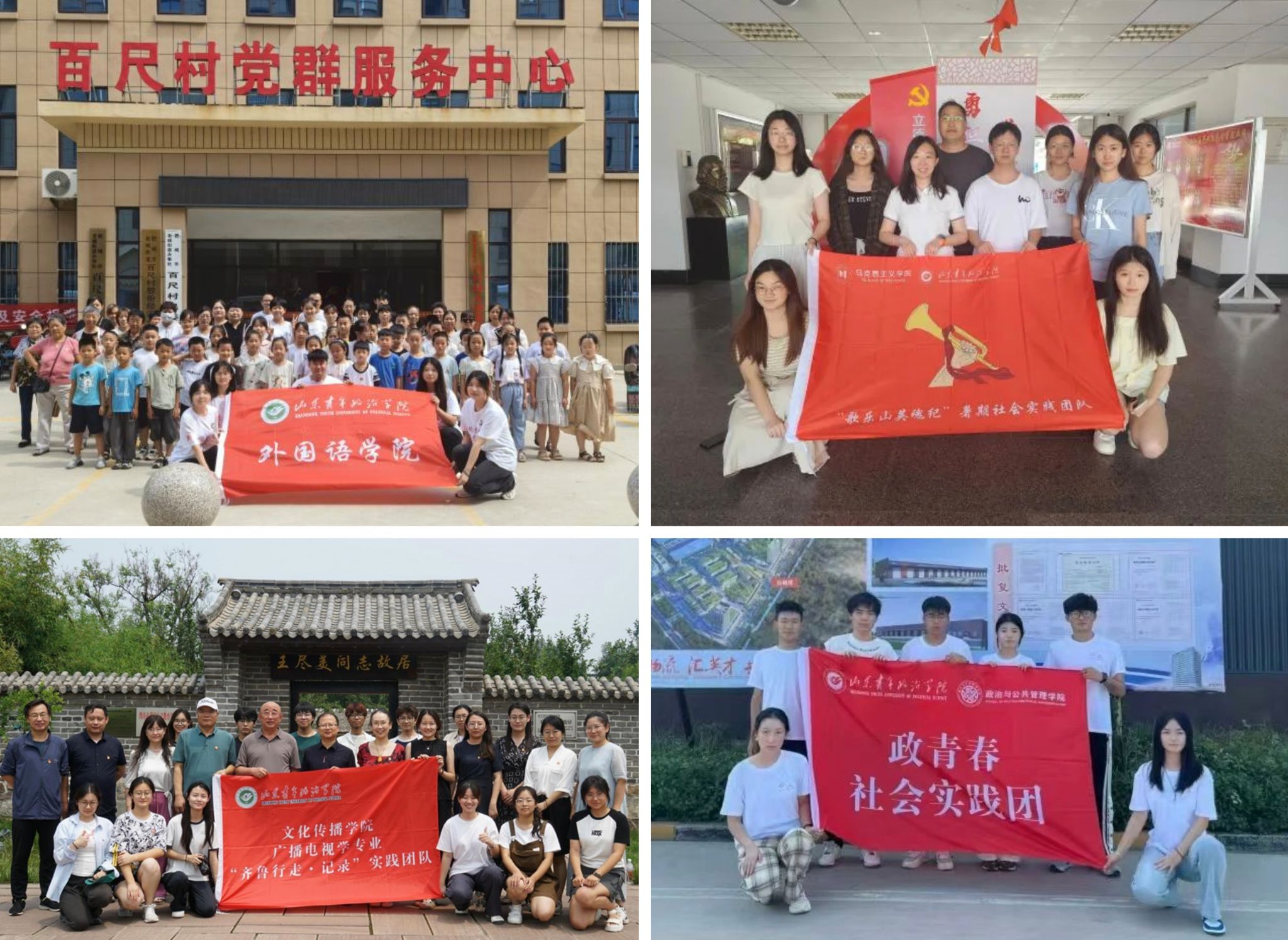 多年来,山青院设立暑期社会实践“红色专项”,组织学子开展寻访优秀党员、宣讲红色故事、调研红色主题等交互式、沉浸式红色实践活动。其中,外国语学院等多学院支教团面向小学生开展红色教学活动,强化党史与爱国主义教育;马克思主义学院等学院的实践团则前往红色教育基地调研,追寻红色足迹;文化传播学院实践团记录齐鲁红色文化,制作微电影丰富思政课内容;政治与公共管理学院等学院则广泛开展“田野思政”,聚焦文化资源挖掘与乡村振兴调研,推动基层社区治理。