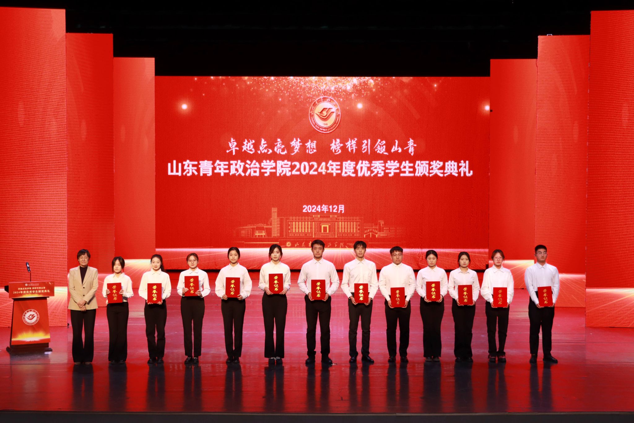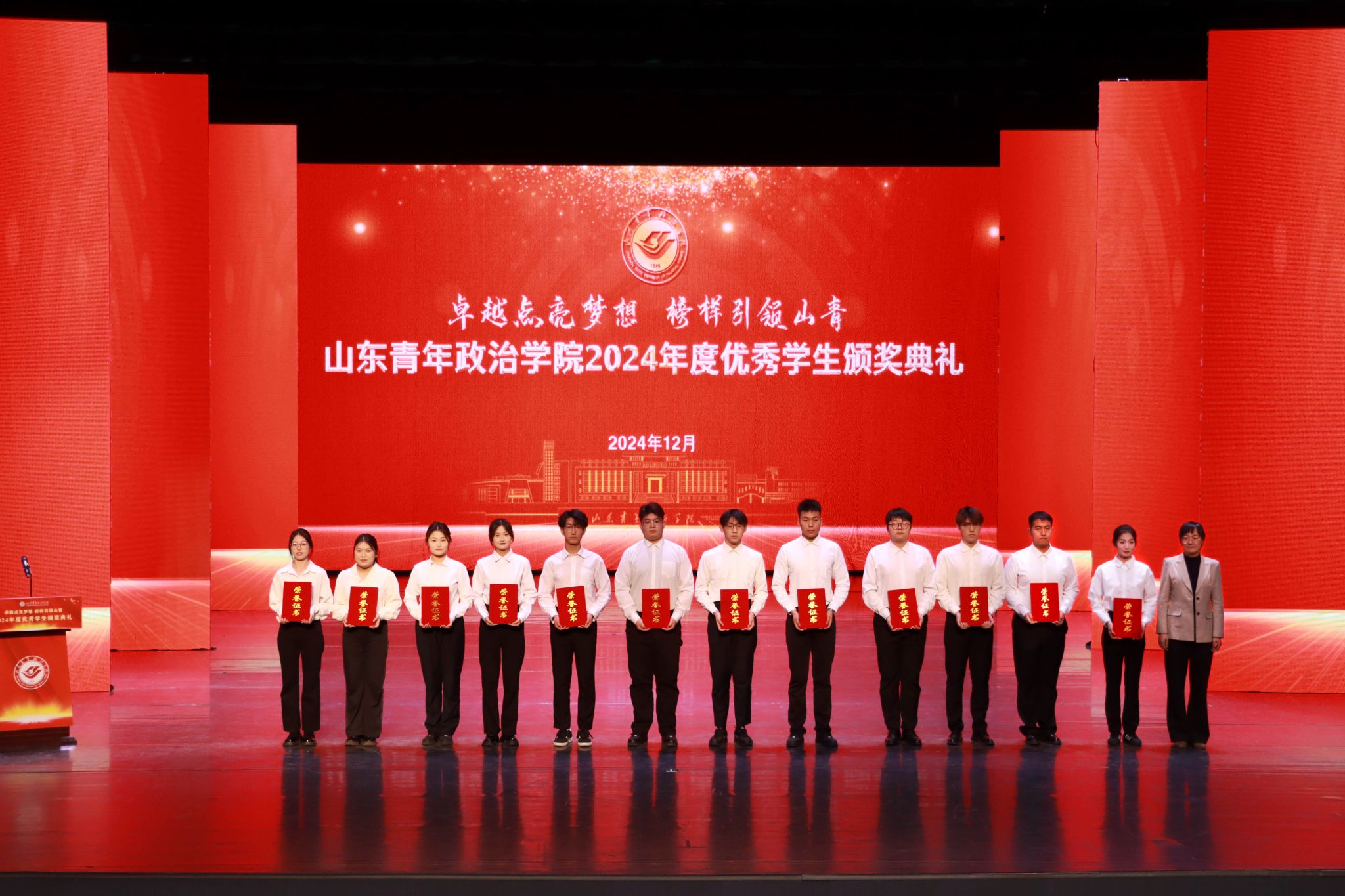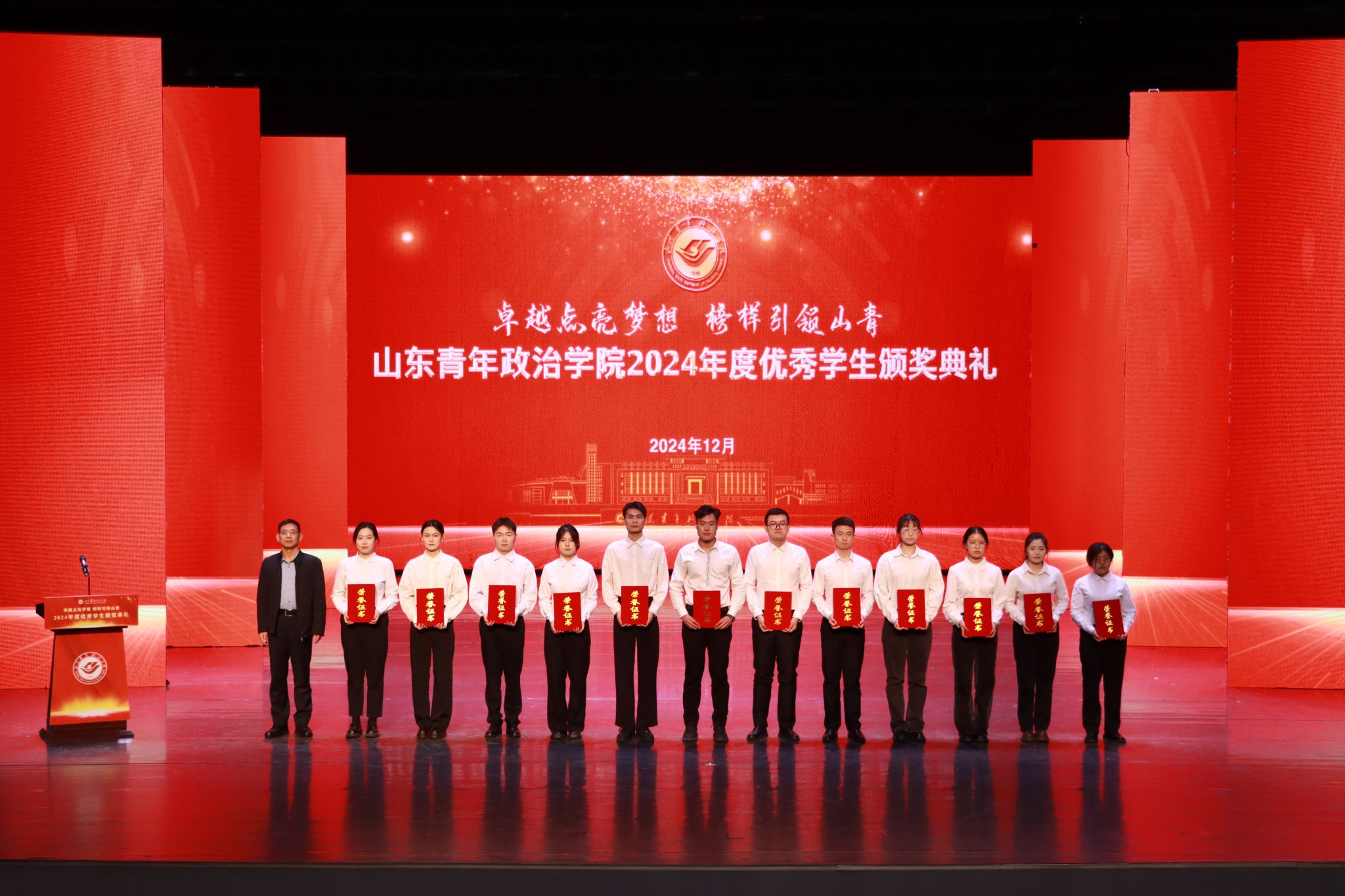 12月26日,学校2024年度优秀学生颁奖典礼在山青剧院成功举行。学校党委书记魏艳菊,党委副书记、院长辛杰,党委委员、副院长李玉英、于秀国,党委委员、纪委书记、监察专员高洪海,党委委员、副院长陈龙溪,党委委员、宣传部部长石瑞宝,党委委员、统战部部长、机关党委书记范红伟出席典礼。