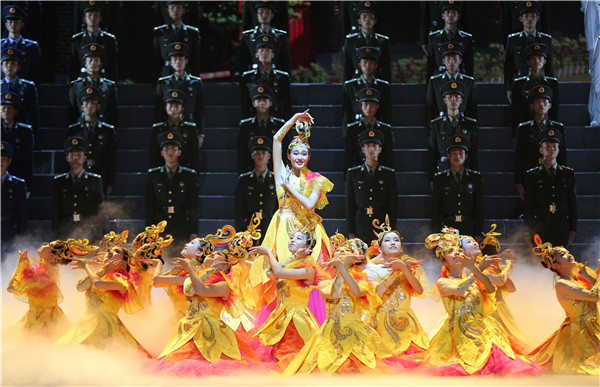 本次晚会以序曲《听党指挥》为开端,《不朽丰碑》《鱼水情长》《筑梦强军》三个篇章将晚会气氛推向高潮,尾声《向祖国报告》《从胜利走向胜利》为晚会画上圆满句号。晚会上,我校舞蹈学院师生参演的歌舞《山丹丹花开红艳艳》,以老百姓的形象反应出陕北人民迎接红军时的深情厚意;男子群舞《大刀进行曲》再现了全国人民奋起抗战,英勇杀敌、团结拼搏的奋斗精神;舞蹈《鱼水情长》,通过多种人物形象的诠释,表现出人民为军人们送粮的情景,体现出深深的军民鱼水情;歌舞《大学生当兵来》则表达大学生想要实现参军梦的愿望,突出了当代大学生的爱国情怀;男子群舞《拼极限》,展现了男子汉的英雄本色,坚毅、刚强、步调一致、不拼到极限誓不罢休的意志力;歌舞《从胜利走向胜利》,突出了军民一家亲、全国人民欣欣向荣,共同期望祖国更辉煌的场景。整场晚会现场激情澎湃,高潮迭起,诠释了中国军人气壮山河的豪情。