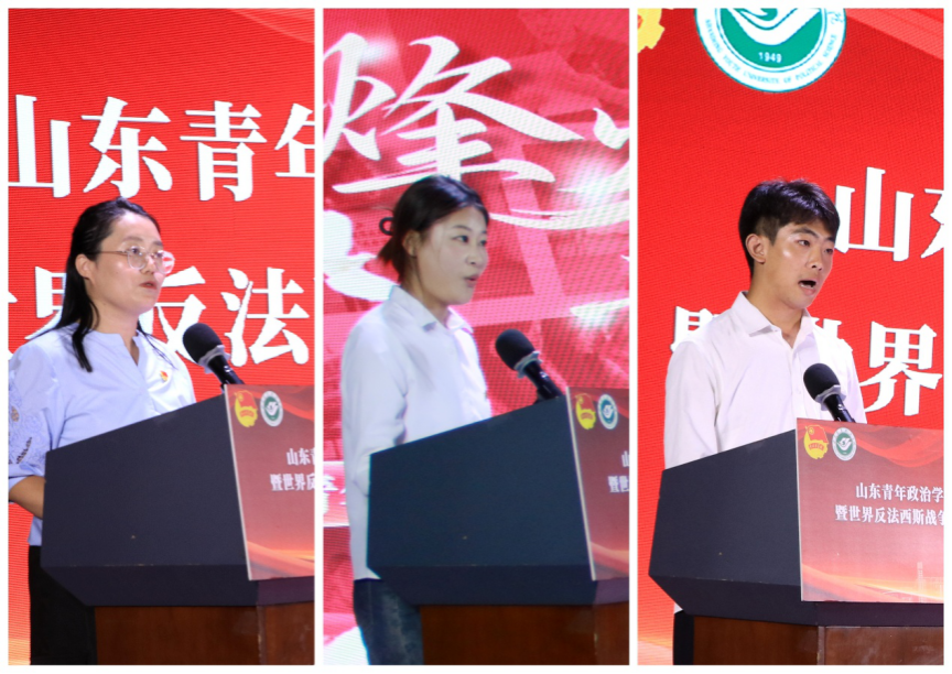 活动在激昂的团歌声中拉开帷幕。随后,全体与会人员集中观看了《铭记历史 缅怀先烈·抗日英雄谱》专题教育片,影片真实再现了抗战英烈奋勇抗争的光辉事迹,深刻激发了在场师生的爱国情怀与历史使命感。分享交流环节,学校2025年暑期“鲁韵烽火 青春接力”专项社会实践团队代表王华欣、校青马班学员代表屈超凡、校青马班班主任代表夏晓丽,分别从实践感悟、青年思考与育人引领三个角度,阐释了对抗战历史的深刻认识,表达了对革命先烈的崇高敬意与传承伟大精神的坚定信念,生动展现了山青师生矢志不渝、同心同向的精神风貌与责任担当。