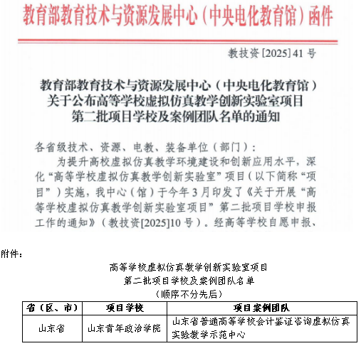 近日,教育部教育技术与资源发展中心公布了高等学校虚拟仿真教学创新实验室项目第二批项目学校及案例团队名单,会计学院“山东省普通高等学校会计鉴证咨询虚拟仿真实验教学示范中心”成功获批立项。