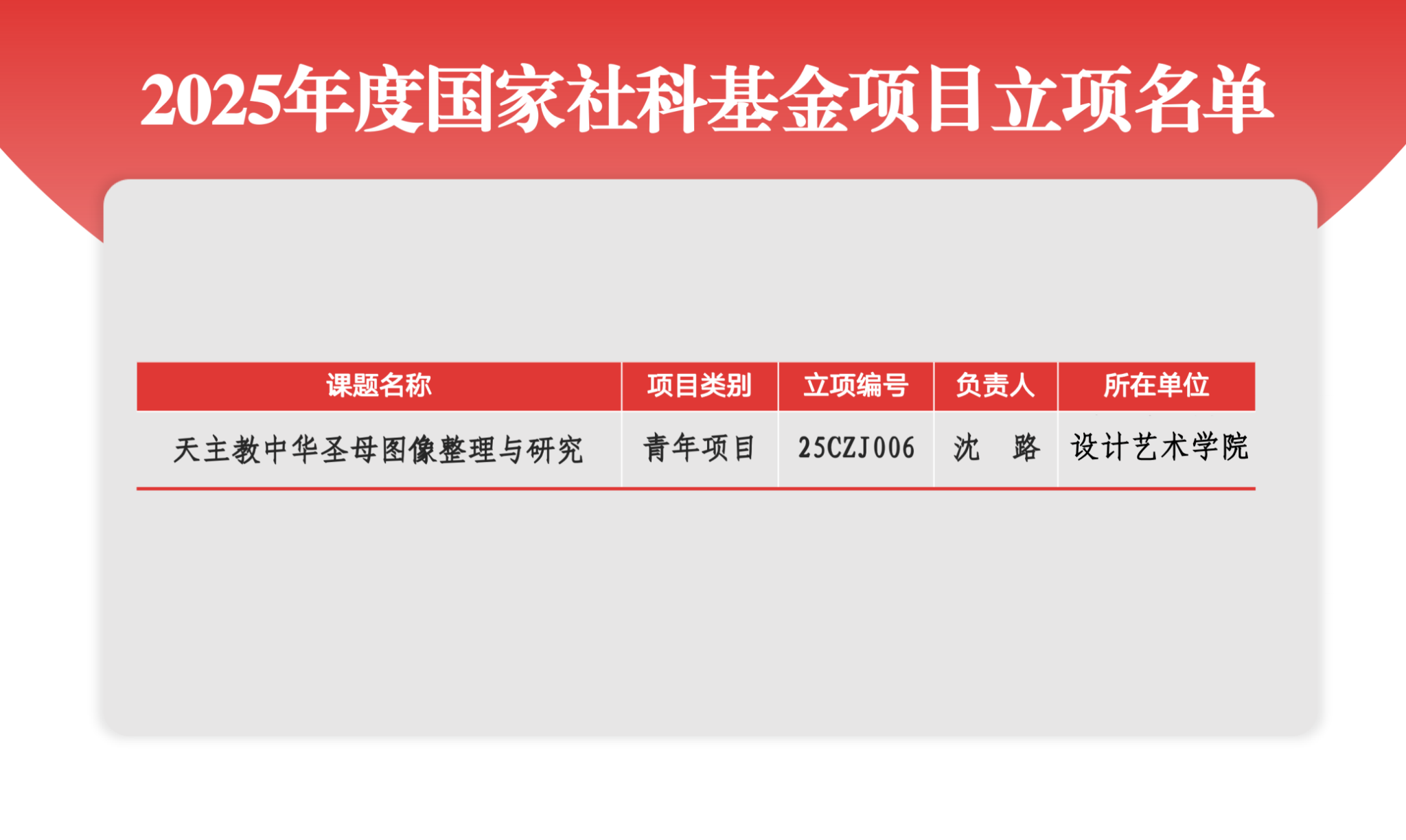 近日,全国哲学社会科学工作办公室公布了2025年度国家社会科学基金年度项目立项名单。由学校沈路教授主持的《天主教中华圣母图像整理与研究》获批立项。