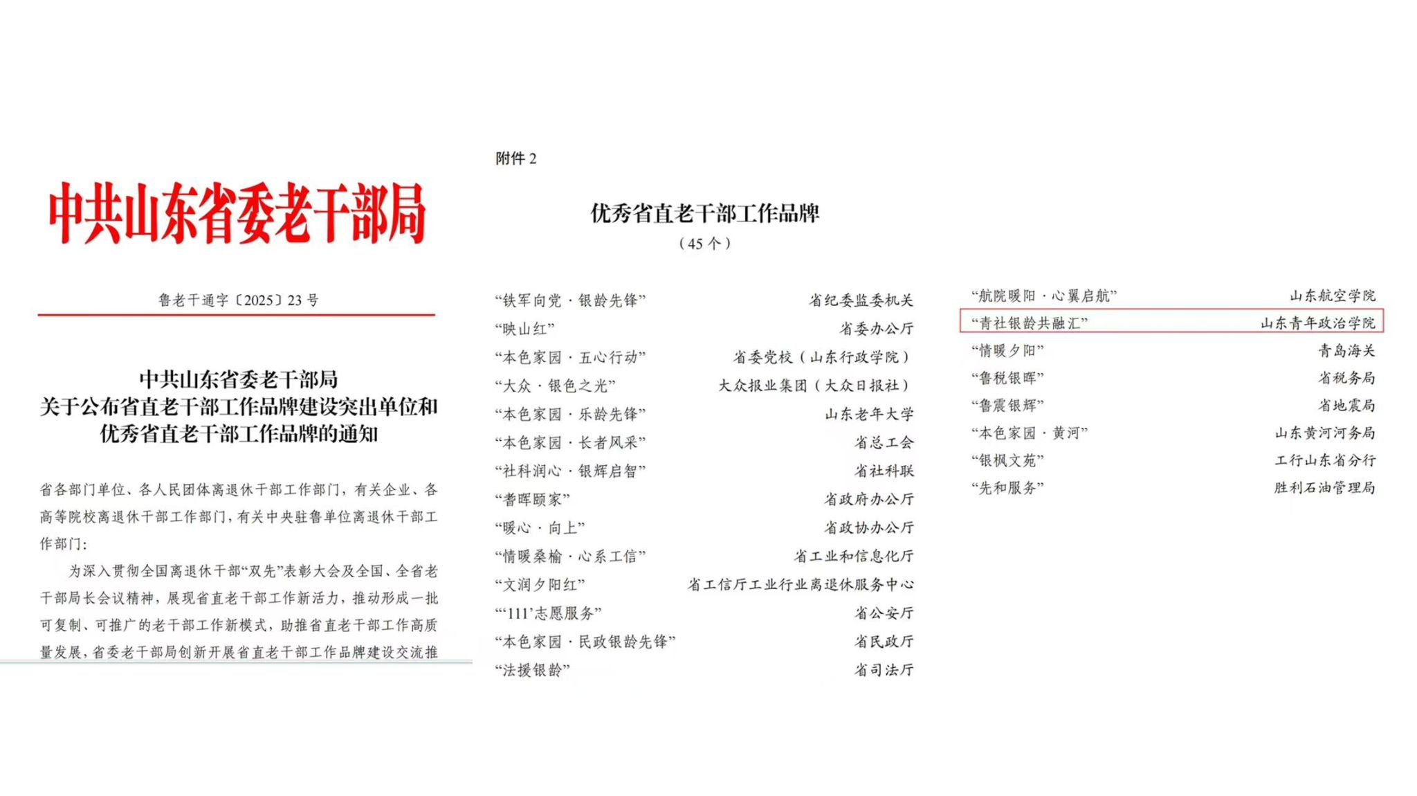 近日,学校收到《中共山东省委老干部局关于公布省直老干部工作品牌建设突出单位和优秀省直老干部工作品牌的通知》(鲁老干通字〔2025〕23号),学校“青社银龄共融汇”老干部工作品牌成功入选“优秀省直老干部工作品牌”名单。