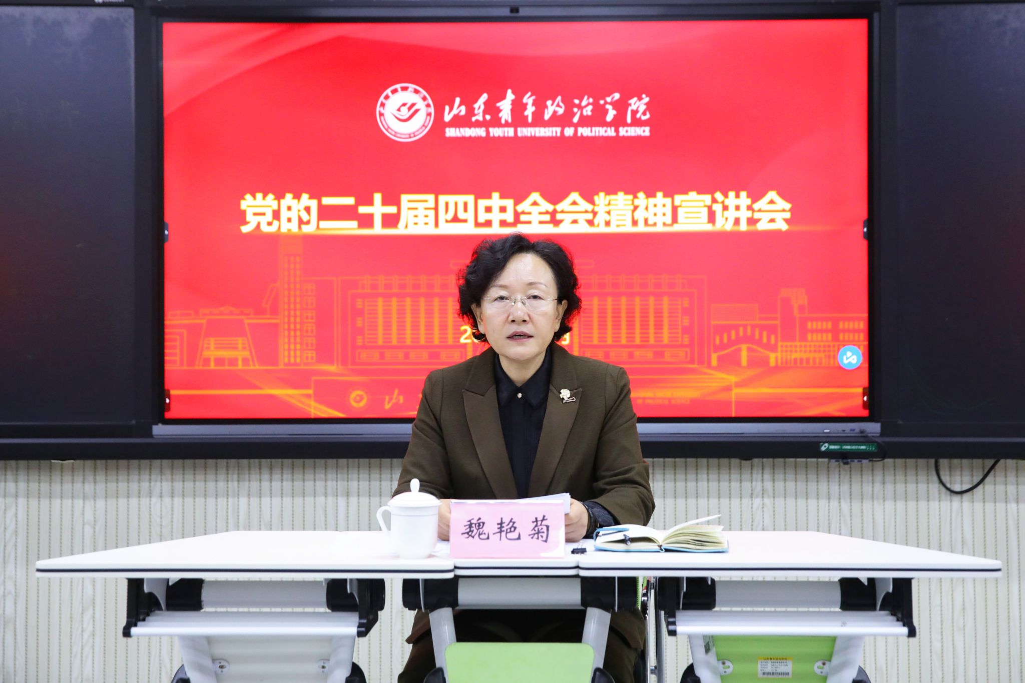 为深入学习宣传贯彻党的二十届四中全会精神,引导干部教师把思想和行动统一到全会精神上来,12月5日,山东高校宣讲团成员、学校党委书记魏艳菊为干部教师代表宣讲党的二十届四中全会精神。