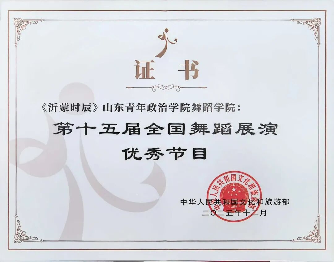 近日学校原创作品《沂蒙时辰》再传捷报!作品获评中华人民共和国文化和旅游部颁发的第十五届全国舞蹈展演“优秀节目”,同时作品被中央电视台新闻频道关注报道。这是继《沂蒙时辰》斩获第十五届中国舞蹈荷花奖民族民间舞奖后再添荣光,以双重国家级荣誉彰显硬核艺术实力。