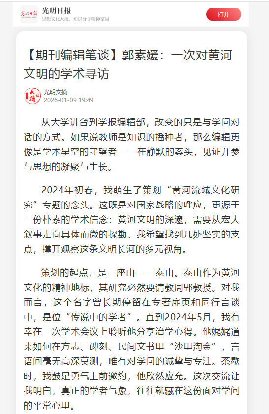 近日,我校学报编辑部郭素媛教授的编辑笔谈《一次对黄河文明的学术寻访》在《光明日报》客户端“光明文摘”栏目刊发。笔谈回顾了学报于2025年第2期推出的“黄河流域文化研究”专题的策划缘起、编辑过程与学术思考,深刻阐释了学报编辑工作在连接学者、引领议题、推动学术创新中的独特价值。