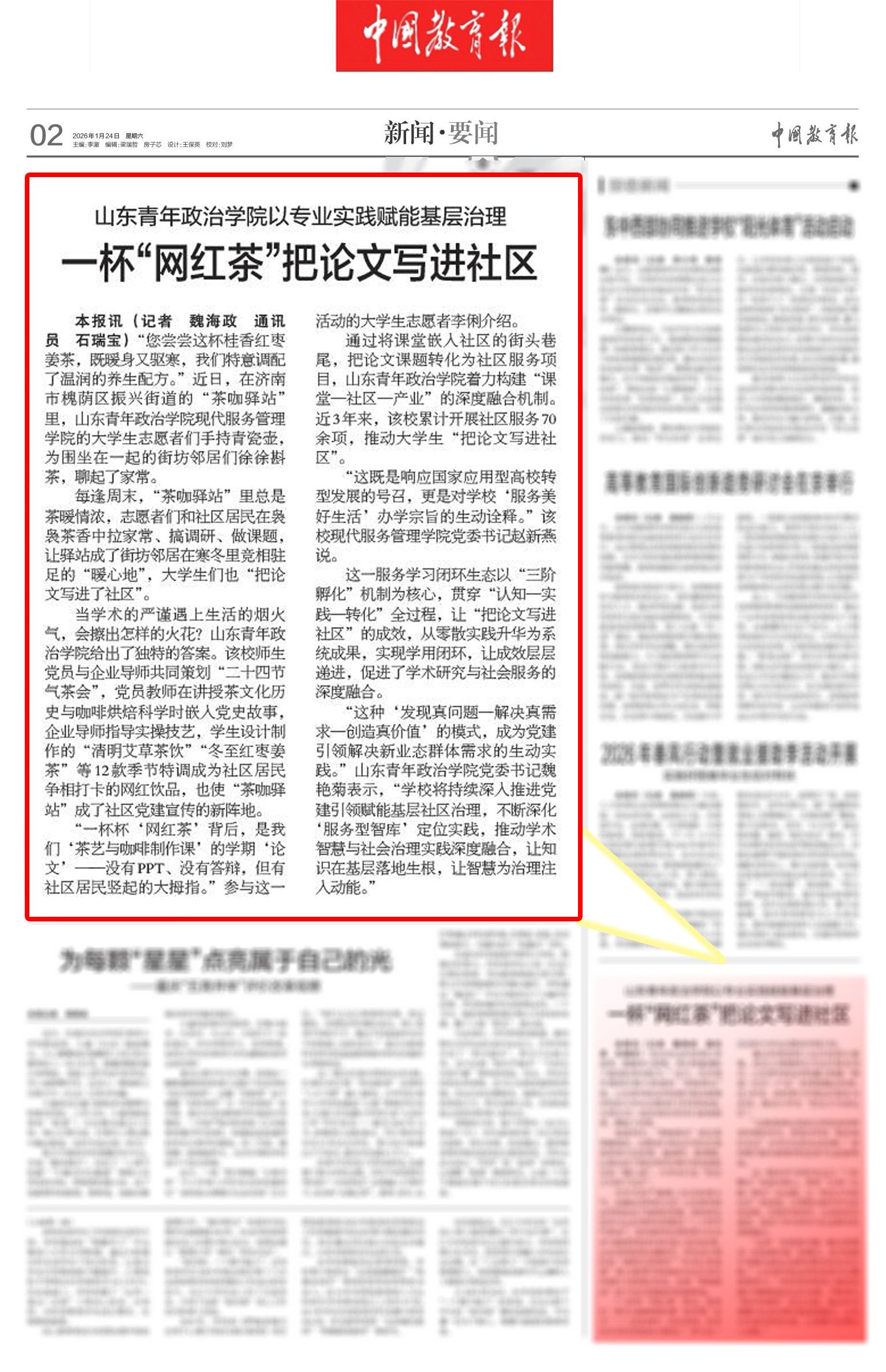 1月24日,《中国教育报》专题报道了我校以专业实践赋能基层治理的创新举措,聚焦师生深入社区一线、转化专业所学服务基层的生动案例,立体展现我校“党建引领、专业嵌入、服务落地”的校地协同育人新路径,充分彰显应用型高校办学特色与主动担当社会责任的鲜明底色。