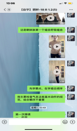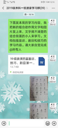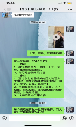 基训类课程组、民舞类课程组授课教师将课程教学内容录制成视频,包括讲解、示范以及要求,以所授课程班级为群体,在微信或者QQ群里进行网络学习与指导,教师根据学生反馈的问题进行针对性指导与纠正,并做好学生考勤、布置每天的学习任务及检查作业完成情况等。