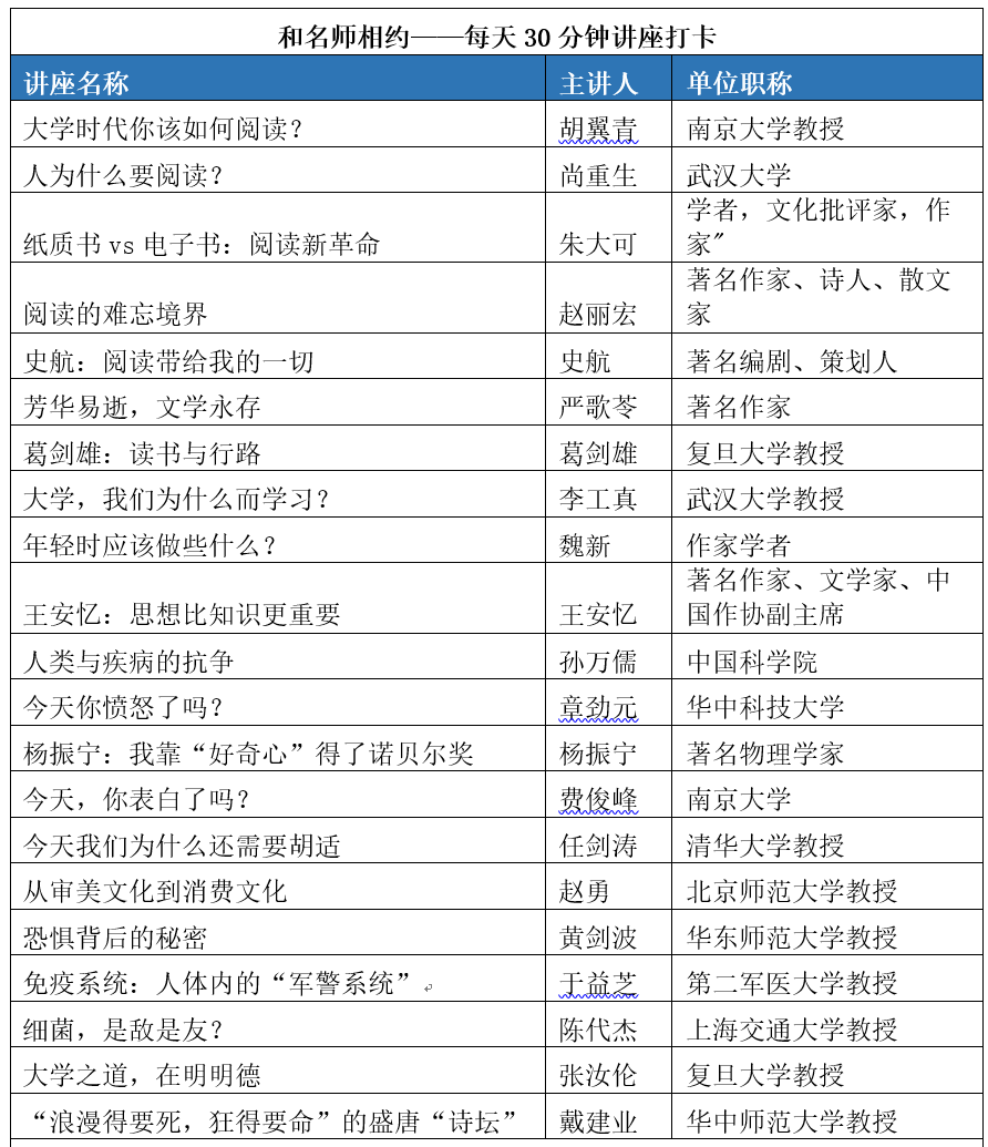 在这个人间最美的四月天里,图书馆精心挑选了“和名师相约”和“每天30分钟听一本书”两个打卡专题,每个专题均有21场精彩讲座,同学们可选择自己感兴趣的参与。