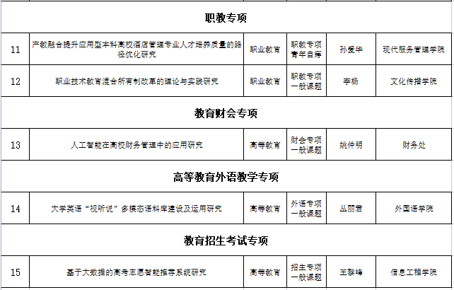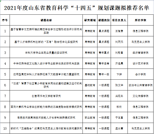 根据山东省教育科学研究院《关于组织申报2021年度山东省教育科学“十四五”规划课题的通知》要求,学校组织了申报工作。经教师申报、学校形式审查、校外专家评审,拟推荐以下15项课题申报本年度山东省教育科学“十四五”规划课题(排名不分先后),其中青年项目4项,专项项目5项。现公示如下: